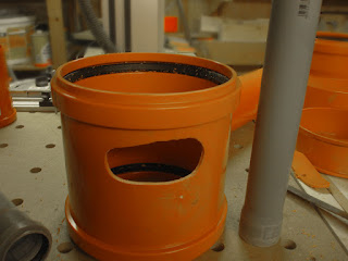 Als erstes habe ich ein längliches Loch in den oberen Topf geschnitten. Da muss jetzt das 50mm HT-Rohr eingeklebt werden.