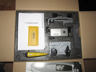 Das Zubehör ist schön in einem Hartschaum-Träger verpack, den man entweder so in eine Schublade legen kann oder auch komplett an die Wand hängen kann. Witzig ist hier das mitgelieferte Pflaster. Mit dazu gehört die Winkellehre, ein Abrichtstein, der Rundlaufabrichter, eine Hobeleisen/Stemmeisen-Schleifvorrichtung und natürlich ein Handbuch und eine Lern DVD.